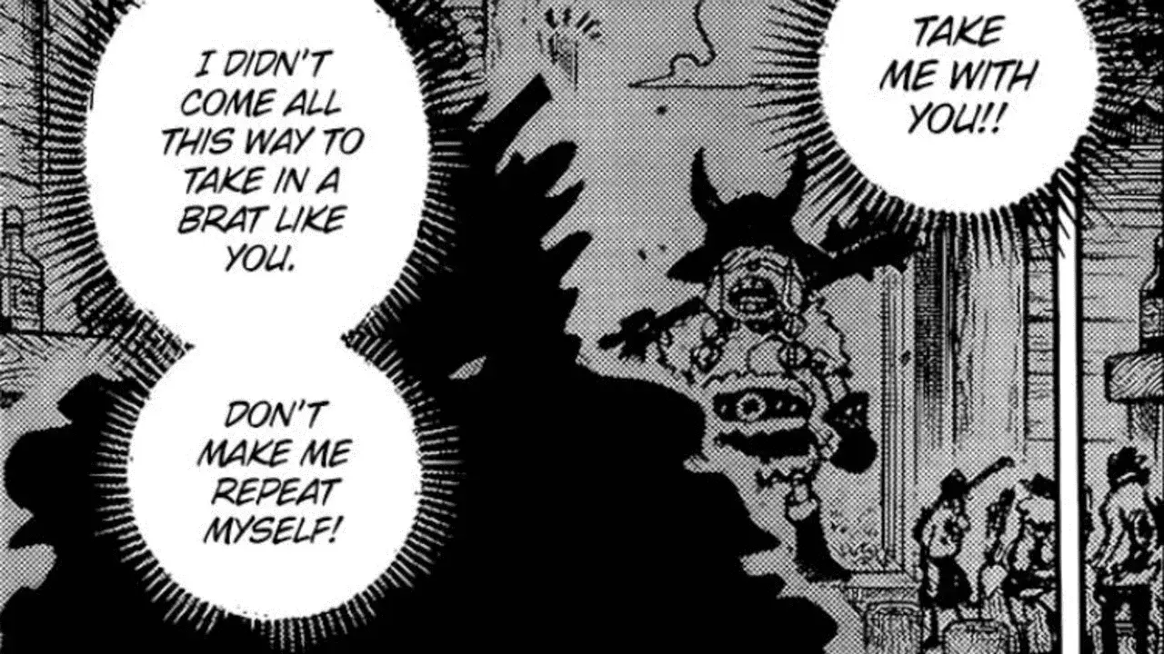 Luffy asks Loki about Shanks, and the giant says that he understands looking up to a pirate in your childhood. He reveals that he also felt this way about someone. In a flashback, we see little Loki asking a silhouette to take him with him. The pirate refuses, and Loki challenges him to a fight, where he would end up badly beaten. The pirate is likely Rocks D. Xebec, as we see him telling Newgate (Whitebeard) to shut up when the other man admonishes him for taking a blade against a child. At present, Loki says that he was born in the wrong era. The chapter moves to the giants fighting the imaginary monsters.