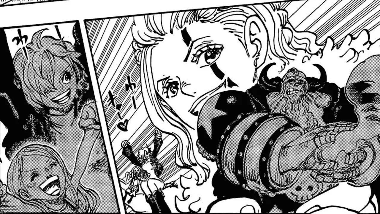 The chapter begins with the remaining Straw Hats members Nami, Jinbe, Usopp, and Brook, asking Gunko who she is. When Colon wonders if she is one of the human intruders, she refutes by saying that they’re not humans but gods. Colon tells her to give back his friends–the other giant children who are still sleepwalking. Gunko says that they have a plan and for that to be realised, the children will be taken to the Holy Land of Mary Geoise. We then see Franky destroying one of the imaginary monsters, and Ripley taking him, Bonney, and Lilith away from the explosion. Jinbe asks if Gunko is a Celestial Dragon and Brook answers that she’s probably even higher ranked than them, making her a Holy Knight.