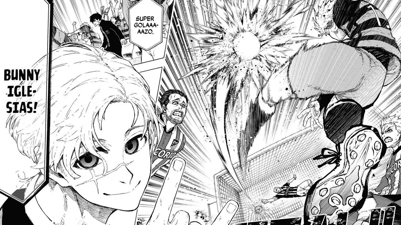 Isagi says he will leave and the man apologises. He says that it’s not Isagi’s fault and he’s a bit insensitive. Isagi points out that ever since he saw him, he noticed a very sad smile on the man’s face. The man jokingly says that it’s rude and gets up to leave. But when Isagi tries to order ‘Auedif’ the waiter says that it’s called ‘Fideua’. It seems that the man twisted the name of the dish around to mess with Isagi. Later, when Isagi goes to the stadium to watch the match, he’s hyped to see all the excitement around him. He recognises Lavinho. But suddenly, he notices a player who seems really familiar. As the tall man plays, Isagi realises that he’s the man he met at the restaurant. He Googles the man and realises that he’s a starter for FC Barcha as well as one of the New Generation World 11. On the field, the player, known as Bunny for his incredible jumping power, scores a phenomenal goal. Bunny Iglesias then smiles at the camera and Isagi realises that he’s one of the people they’ll have to beat at the U-20 World Cup. Elsewhere, we see Sae Itoshi watching the match, and Bunny, with an angry look on his face.