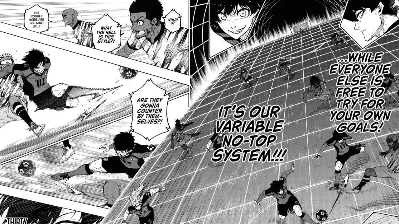 The chapter begins with a flashback of Isagi talking in the dressing room during the break. He says instead of building up with everyone like before to build a counter, he and Rin will pass back and forth and tear up the center of the field. In the present, we see the dual aces do just that as the Nigerian team scrambles to keep up. During the play, Rin remembers a memory from some time ago when Ego had sent him for the special training.