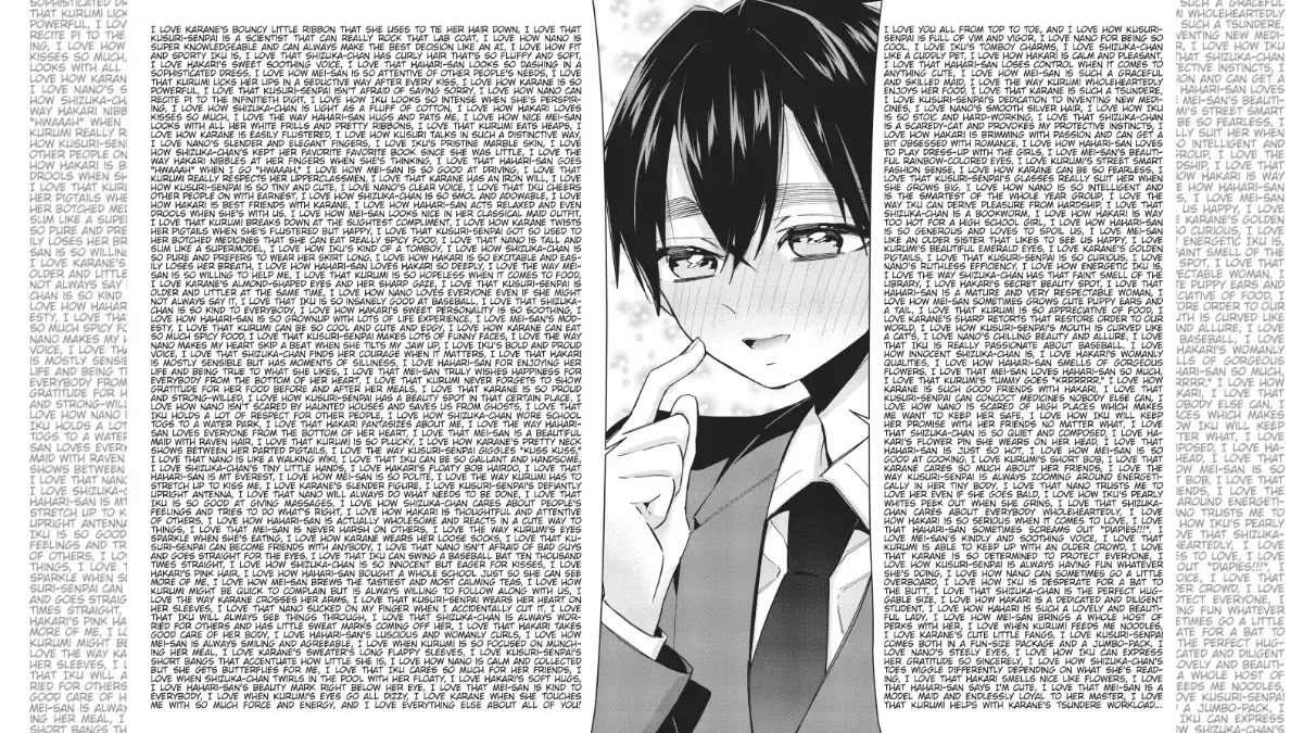 The love speech, which features Rentarou enumerating the many reasons why he loves each of his 11 girlfriends, has become a popular piece of media since it first came out in the 37th chapter of the manga back in November 2020. The speech took up an entire page and two elongated speech bubbles, with the font significantly decreased from standard sizing to fit.
