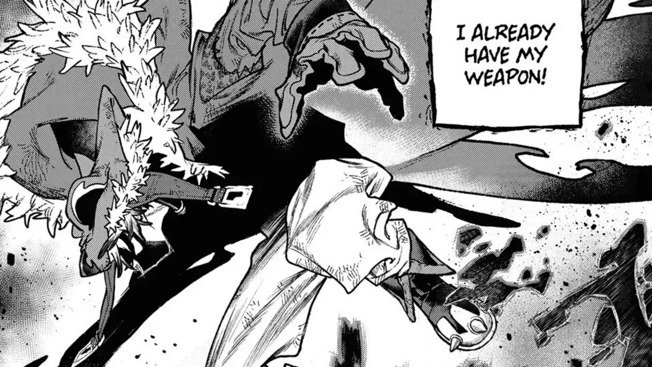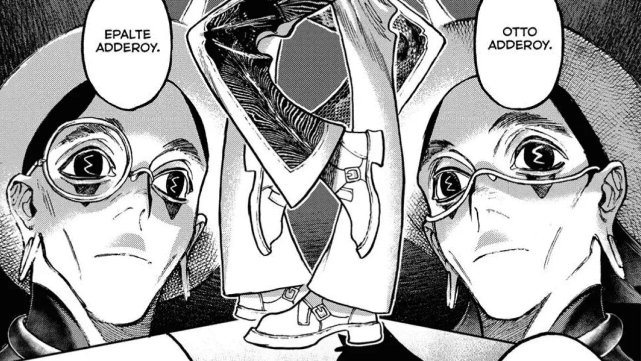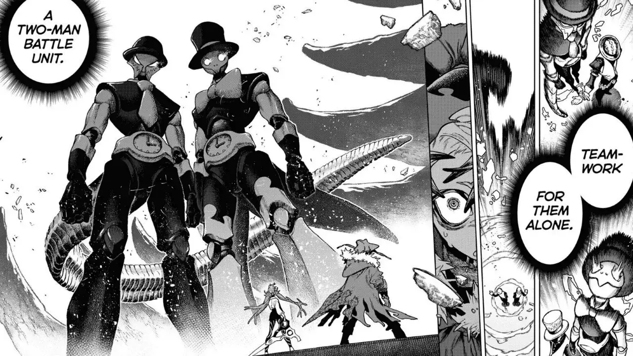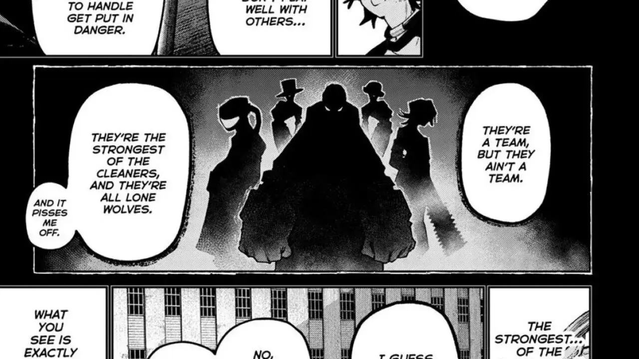 The chapter, titled ‘Danger’, begins with the Twins holding two tiny dolls on their palms. Riyo introduces that they’re Otto and Epalte Adderoy from the Danger team of the Cleaners. Mymo teasingly says that the veteran Cleaners know exactly how powerful these two are. In a flashback, we see Rudo sitting beside Follo who seems to have passed out after training. He asks Zanka and Enjin what the Danger team is like, and both of them answer with the word ‘Solitary’. Enjin explains that while going out to treacherous places to fight Trash Beasts, it’s crucial for Cleaners to team up together to properly defend themselves.