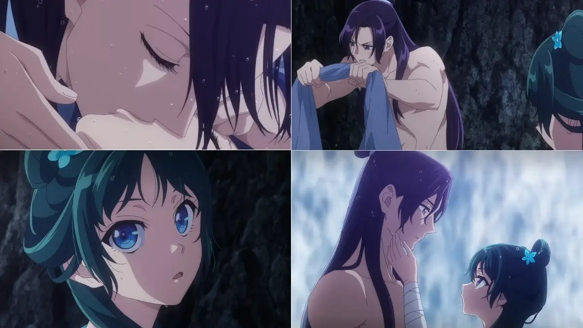 Then came the aftermath of the failed ambush on Jinshi, when he carried Maomao and leapt off a 50-foot waterfall. The temperature may have dropped, but things between them definitely heated up from there!