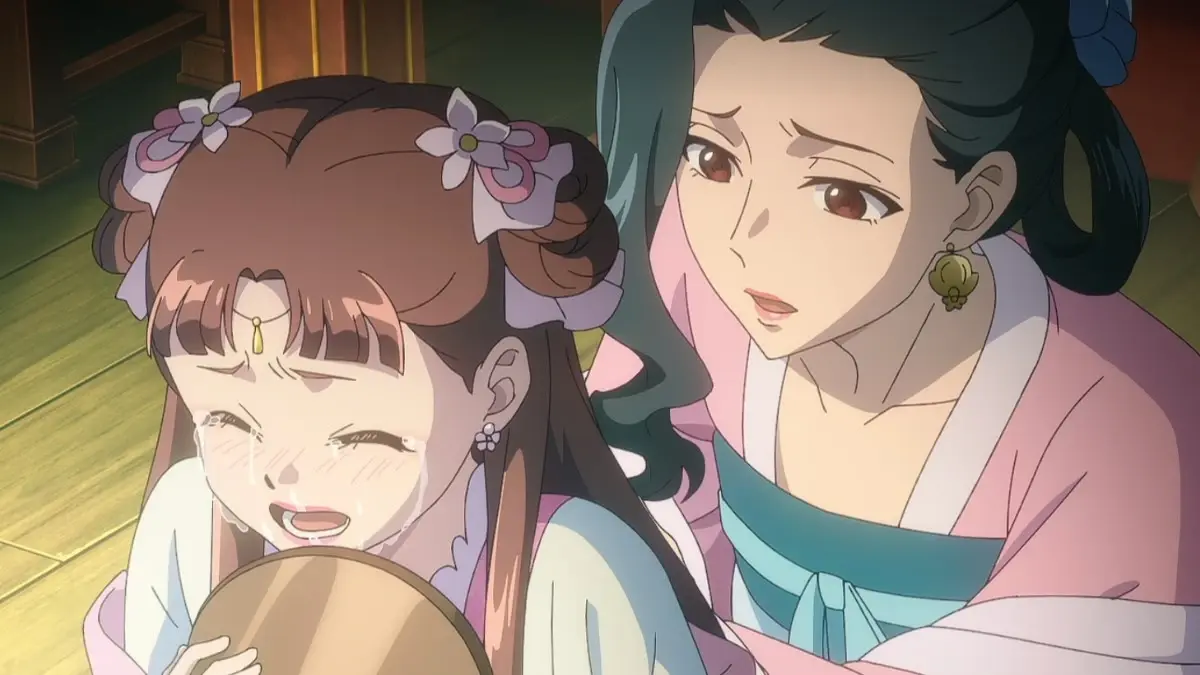 One of Lishu’s ladies-in-waiting publicly berates and humiliates her in front of Jinshi, Maomao and his entourage, and attempts to take Lishu’s bronze mirror from her. Jinshi steps in at once, firmly rebuking the maid and warning her not to cross the line again.