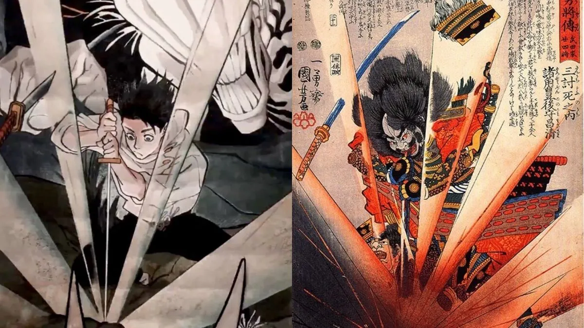 The second and third art references pass in the blink of an eye, but they feature Maki and Yuta both exterminating curses in a traditional Ukiyo-e style.