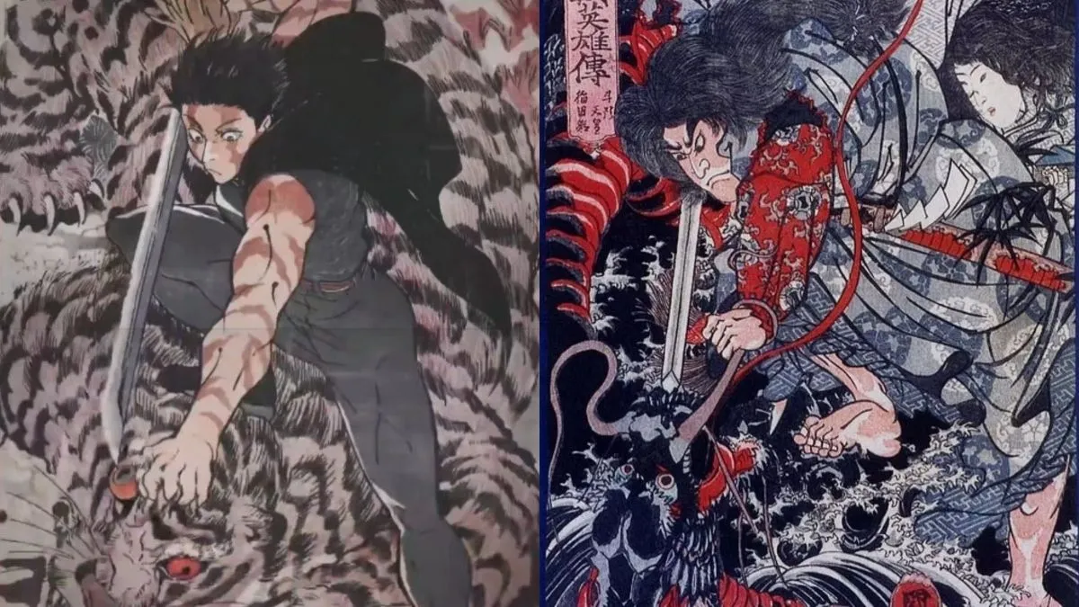 Meanwhile, Yuta’s artwork references the 1848 woodblock print “The Suicide of Morozumi Masakiyo” by Utagawa Kuniyoshi.
