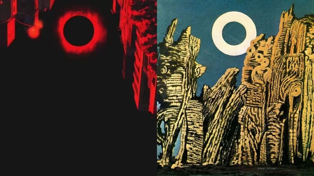 The original painting, which was produced through a technique called ‘frottage’, features a forest full of petrified wood, and at the center, a cold sun encased in a halo–evoking an atmosphere of “otherworldliness”.