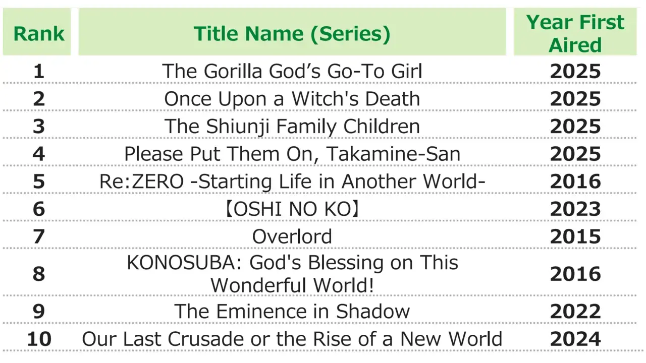 The Japanese media conglomerate KADOKAWA has published its earnings report for the first quarter of fiscal year 2025-2026. In the Net Sales of the Top Ten Best Selling Titles section, we see Re:ZERO -Starting Life in Another World taking the first place. Given the popularity of the anime, manga, and novel, this is not surprising. However, in the Animation/Film subcategory, a Spring 2025 shoujo anime, The Gorilla God’s Go-To Girl, has beaten everyone.