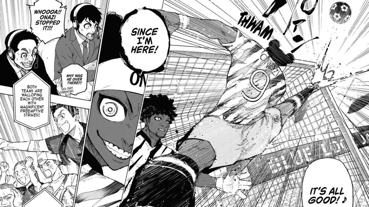 But just in the nick of time, Onazi kicks away the ball, stopping Japan from scoring the first goal. The audience is dumbfounded as they wonder how he reached there so quickly. The excited fans cheer for their team, but Isagi is looking only at the ball. His eyes focus on the object and he says that he can see a vision of their victory. It seems that the protagonist already has a winning plan in place.