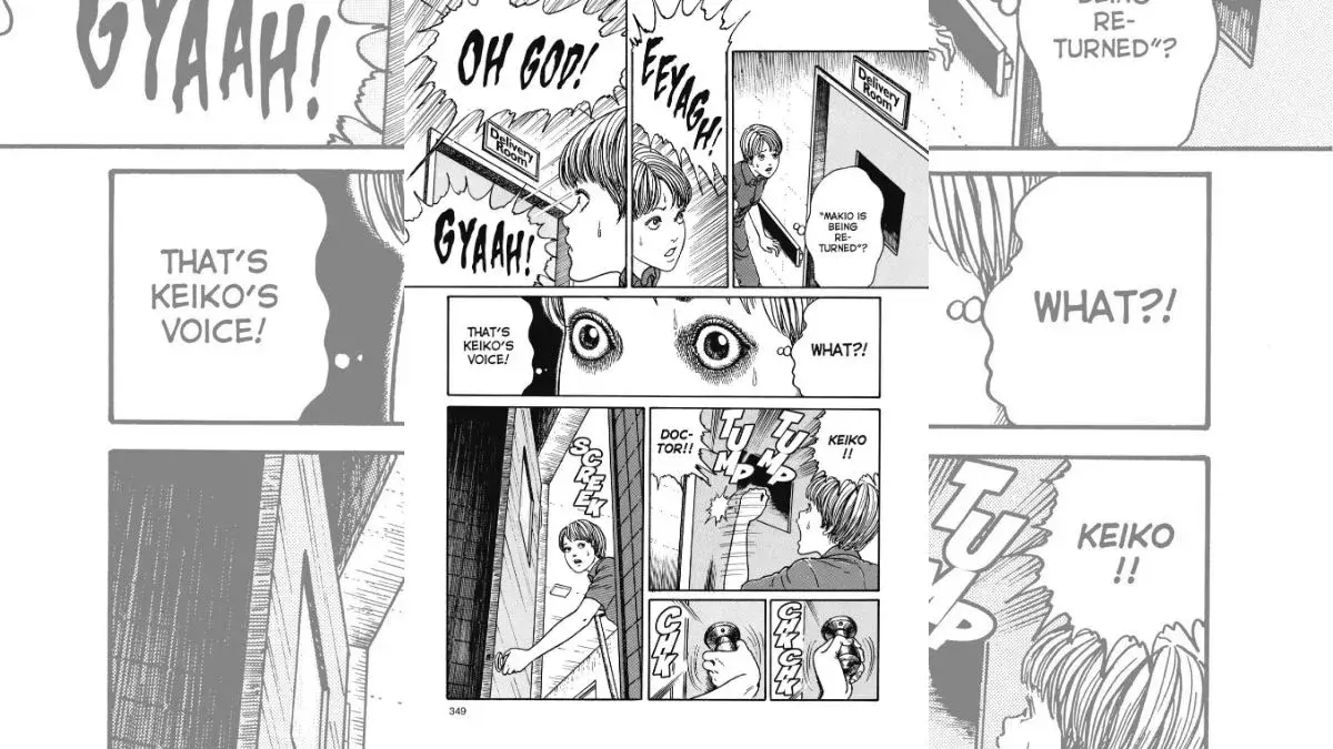An example that mirrors this is Chapter 11 of Uzumaki, “The Umbilical Cord”, where the featured character, Kirie, is rattled by unusual occurrences in the hospital she is staying at. The tension increases as events turn even more mysterious and confusing, reaching towards a horrifying climax as she discovers just what is wrong.