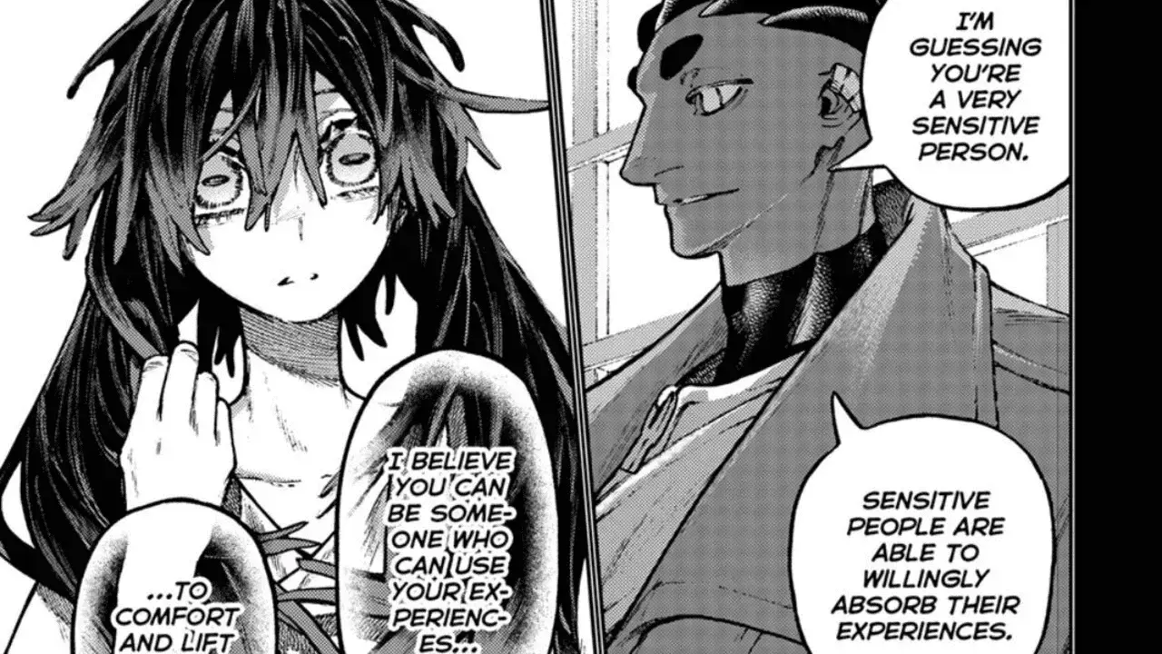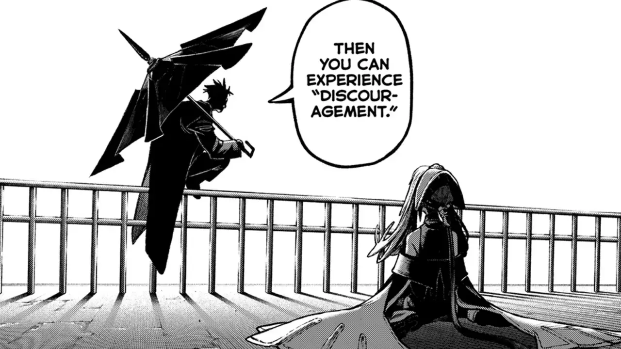 He tells her to sit there like that and melt into a puddle of her own tears. That way, she will experience discouragement. When it gets too much, he tells her to stand up and prove how wrong he was for calling her useless. Then, she will have experienced vindication. Enjin leaves her there, and we see the Twins once again attacking Riyo and Rudo with their massive puppets. Rudo decides that he can never break a Vital Instrument, and the only way he can stop the Twins is by destroying their Chokers. Looking at them straight, Riyo smiles and says she forgot they were wearing Chokers, and that’s how Mymo can control them. The chapter ends with Mymo asking if they’re ready to neutralise their own friends.