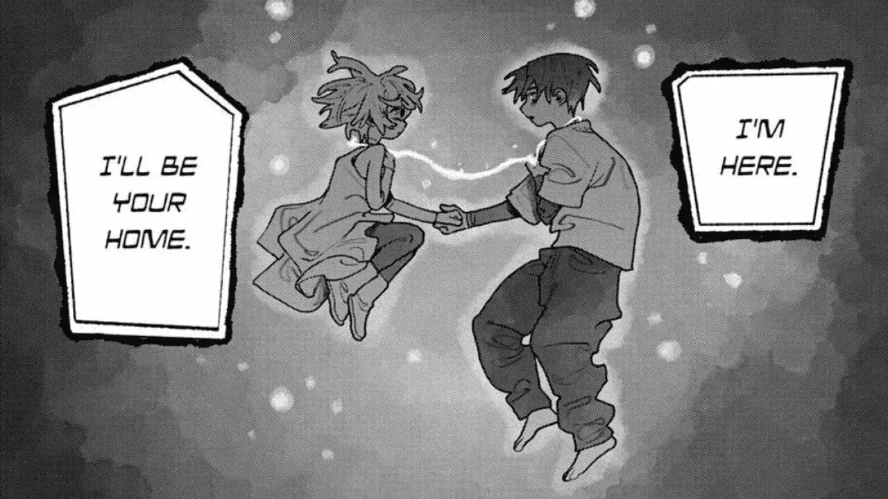 One night, Gountess wakes up as he faintly hears Lily crying for her mother. He realises that’s why she always goes back to her empty broken home every night so she could be connected to her parents. The happy faces she makes is her attempt to fight against her sad life. He reaches out to her by calling her through the Choker, and says that he’ll be her home. Back at the present, Gountess says that his real power is to reach their hearts through the Chokers. He reads the thoughts and delivers them to the soul. In the final panel, we see Mymo telling him that he will gladly make use of that power.