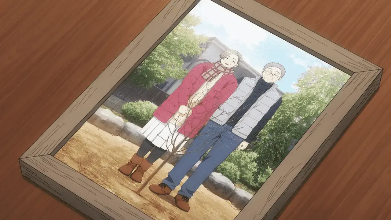 The next day when the group visits again, things are a bit different. As Ito-san reminisces about the old days by looking at pictures, Tsubaki wants to see a photo of the two of them. Ito-san brings out a frame where we see the beautiful older couple standing side by side in front of a small plant. A flustered Sakura says in the picture Yui-san looks how Tsubaki looks around Umemiya, hinting towards her deep feelings for her husband. Ito-san surprises everyone by saying that he’s relieved. He reveals that he always loved his wife, and thus was happy with her. But due to her quiet and reserved nature, he never understood if Yui-san was as happy with him, especially because their marriage was arranged. But Suo intercepts, asking if the tree they’re standing behind in the photo was planted by Yui-san.