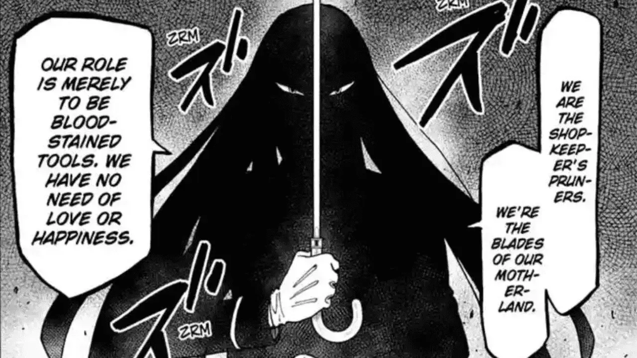 Yor urges Hemlock to stop and promises to not get in the way of his work. But Hemlock keeps swinging his sword at her, intending to kill her. Hemlock is angry because due to Yor’s constant talks about her family, even Gympie has started talking about getting a boyfriend. He says Yor’s head is now filled with thoughts of welcome home kisses and whatnot. Yor tries to protest, saying she’s doing all this to keep up her cover identity. But Hemlock says that none of that nonsense belongs in The Garden. They’re the Shopkeeper’s pruners, and the blades for their motherland. They have no happiness beyond being bloodstained tools.
