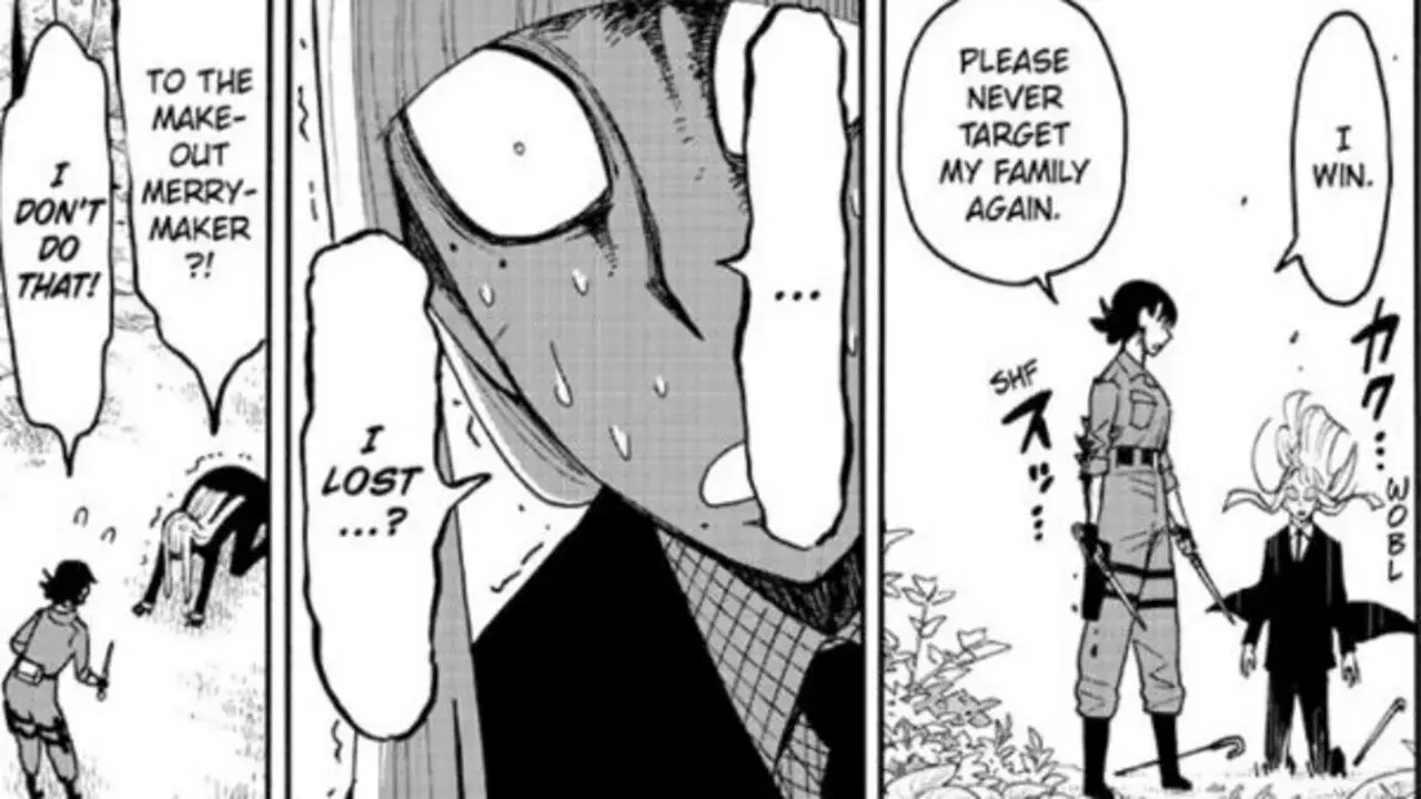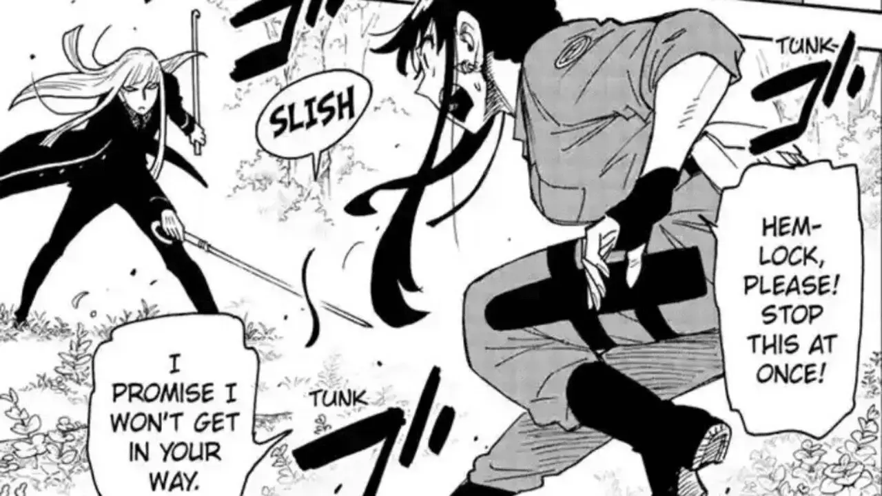 But then he says that he’ll kill her brother and her family to cut her off from all earthly shackles. This shocks Yor still, and Hemlock continues to say that he’ll talk to the Shopkeeper and bring her their heads shortly. Yor then springs into action, cutting Henlock’s cheek with one of her daggers and saying she won’t let him do that. The two start fighting for real, with Yor giving back this time. In the end, she comes out as the winner after a long tussle, and almost kills Hemlock. But she pulls back at the last minute and lets him fall to the ground. Director McMahon’s bird then comes back and Yor asks Hemlock to follow it with her. However, Hemlock is too shell shocked to move as he can’t get past the fact that someone who was socialising all this time could beat him. The final panel shows Yor pulling him along with her as he keeps murmuring to himself.