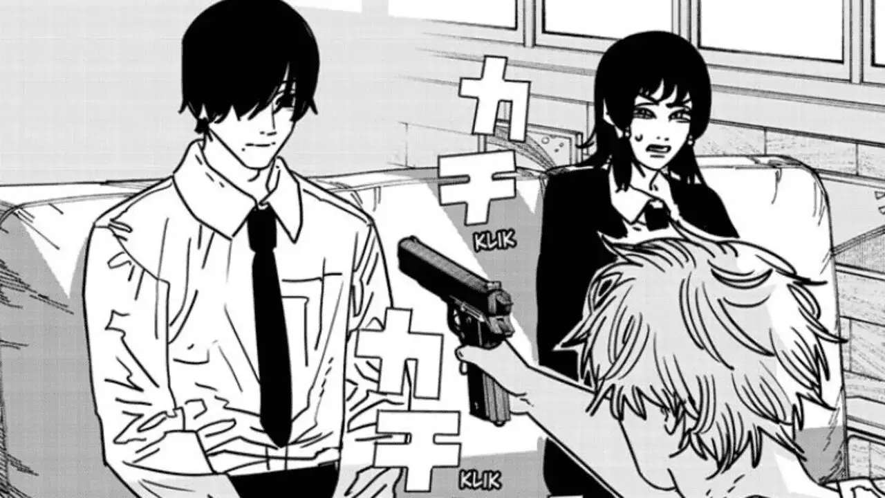 Denji suddenly asks if that was the reason why they turned him into Chainsaw Man and killed Nayuta. Yoshida says that he hasn’t forgotten their deal and pushes a gun in Denji’s direction. He says that if Denji lets himself get turned into a weapon, he can kill Yoshida and the others when he pleases. However, when Denji picks up the gun and pulls the trigger, it’s revealed to be empty and Yoshida says he had hoped Denji has forgiven them by now. Yoru laughs and says that humans are foolish beings who always lie and scheme. She throws the cake a waiter brings into Yoshida’s face. In the last panel of the chapter, Yoru points a finger at Yoshida and says “Bang!”